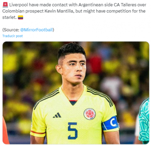Según reporta el diario Mirror, el Liverpool se ha puesto en contacto con el Club Atlético Talleres de Argentina por el colombiano Kevin Mantilla.