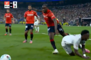Fue en ese momento cuando el brasileño fue derribado dentro del área. En primera instancia, pareció ser un empujón Enzo Boyomo. No obstante, a pesar de que Vini Jr quedó tendido en el césped, el juez del partido no lo consideró infracción.