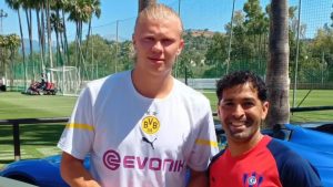 Allí, Erling Haaland se sacó fotos con los futbolistas guaraníes, momento para el que se presentó con una prenda de entrenamiento del Borussia Dortmund, el club en el cual desarrolló parte de su carrera antes de saltar al Manchester City.