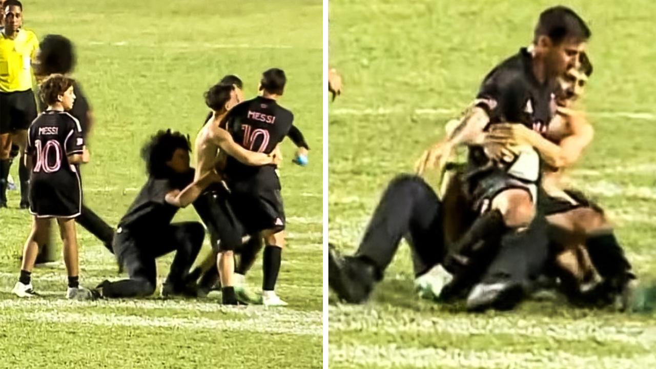 Uno de los espontáneos consiguió llegar hasta el exjugador del Barcelona, pero fue placado de inmediato por los miembros de seguridad privada. En su afán por proteger a los futbolistas de la invasión, los guardias acabaron derribando al propio Lionel Messi en la acción. El argentino, que había ingresado al inicio de la segunda parte, vivió un momento de máxima tensión física.