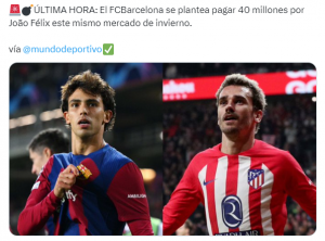 No obstante, según Mundo Deportivo, el Barcelona ya avisó al conjunto de la capital española que no ofertará más de 40 por la compra de la ficha de Joao Félix.
