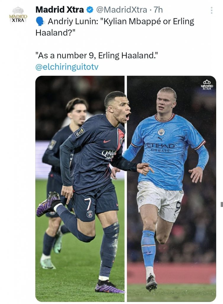 Andriy Lunin tuvo un intercambio con El Chiringuito, en el que eligió a Erling Haaland por encima del que puede ser su compañero, Kylian Mbappé.