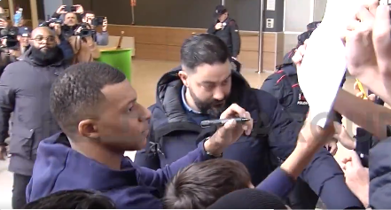 Tanto, que se arrimó para sacarse fotos y firmar autógrafos. No obstante, al momento de acercarse a una pancarta para estampar su rúbrica, Mbappé se detuvo al ver que estaba dibujado el escudo del Real Madrid.