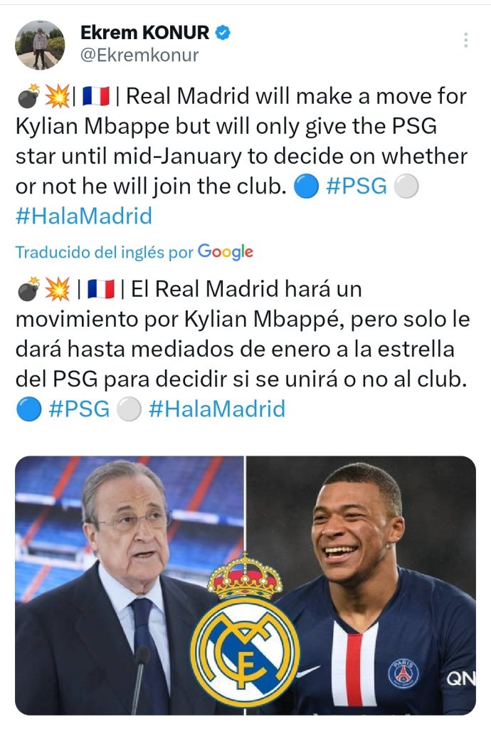 De todos modos, de acuerdo a Ekrem Konur, Florentino Pérez y compañía no quieren ser parte de un nuevo culebrón del mercado de pases. Entonces, le darán tiempo hasta el 15 de enero.